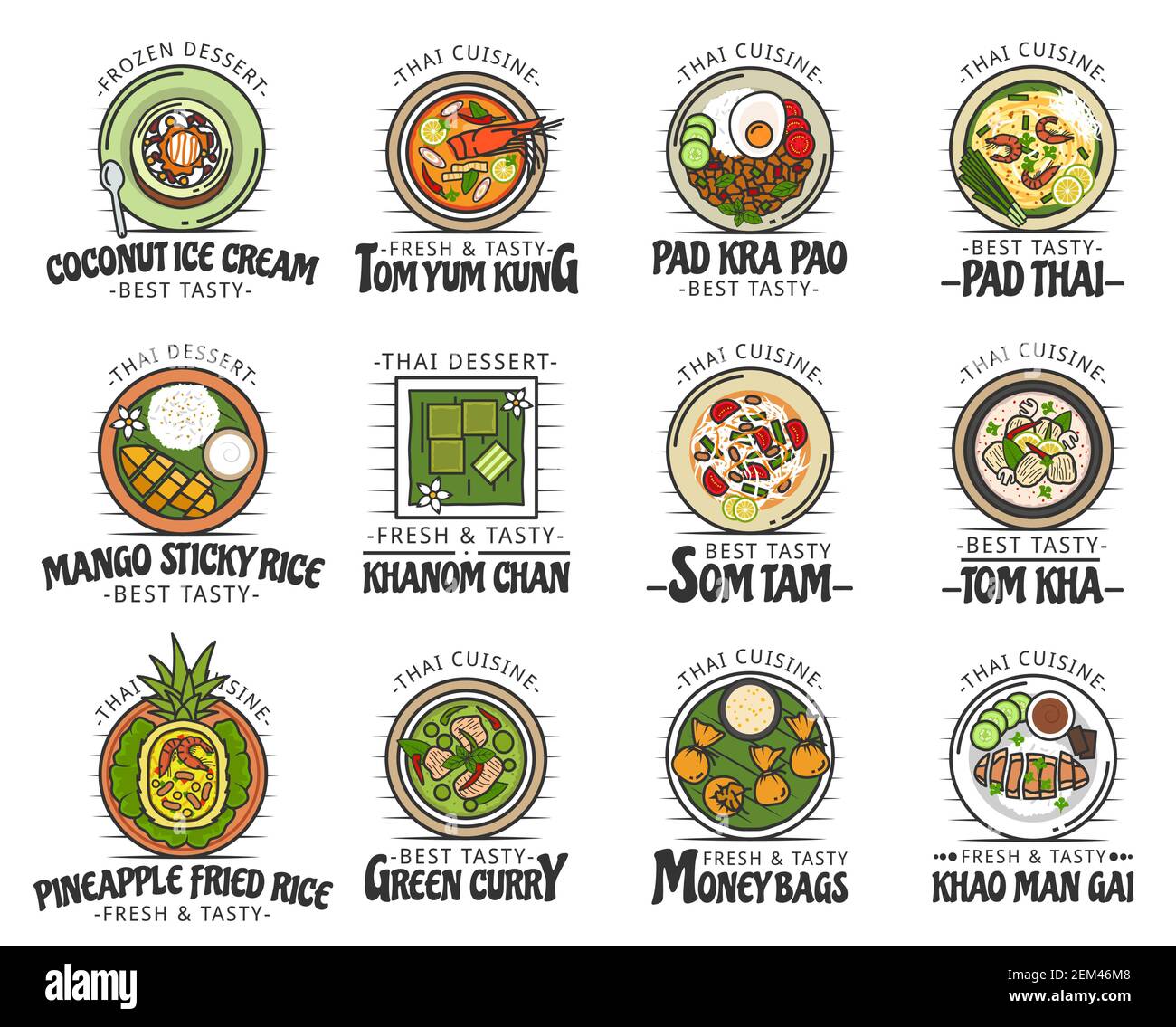 Thai Kuche Essen Und Desserts Isoliert Vector Kokoseis Tom Yum Kung Pad Kra Pao Mango Klebrigen Reis Khanom Chan Som Tam Tom Kha Zirbeldruse Stock Vektorgrafik Alamy